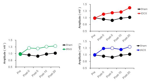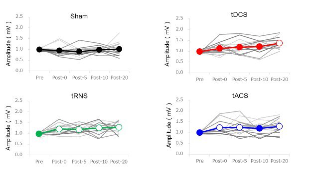 3.本研究結果より,tRNSはtDCSやtACSより安定して刺激後に皮質脊髄路興奮性を増強させることが明らかになりました.