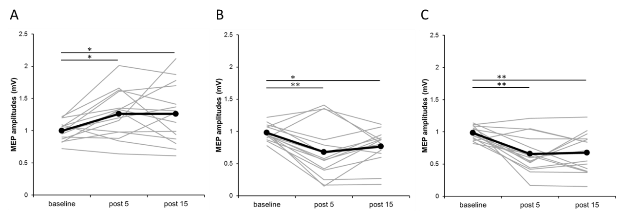 ポイント②:一次運動野に対して磁気刺激を行うと,一次運動野が活動し,末梢の筋から運動誘発電位(MEP)を記録することができます.このMEP振幅値をみることで皮質脊髄路の興奮性を評価することができます.本研究では,筋収縮誘発条件でMEPが増加し,筋収縮非誘発条件でMEPの低下が認められました(図2,図3).